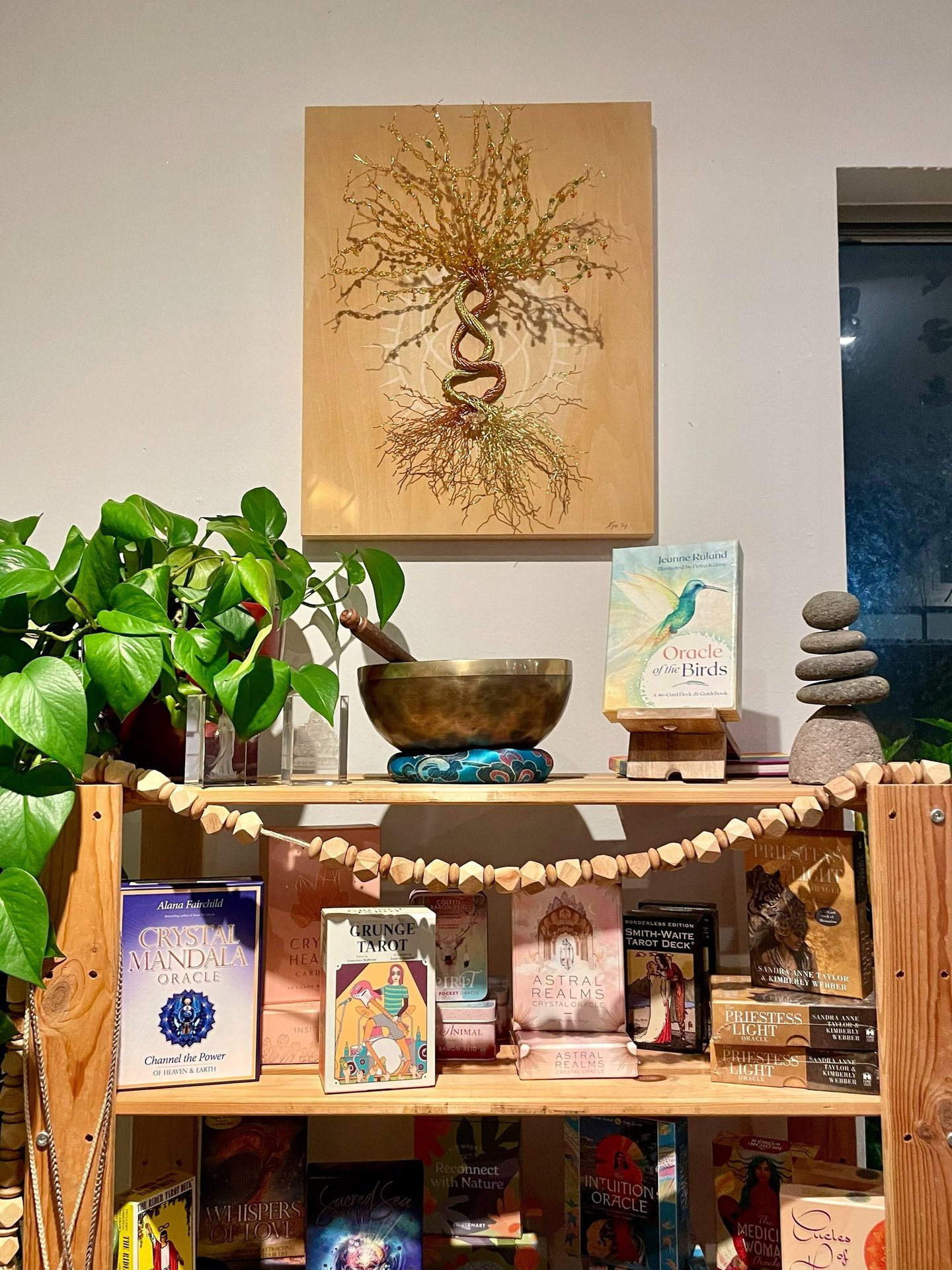 This piece holds the black barren branches of the winter solstice (introspection, wisdom and renewal), and the bright green leaves of the summer solstice (harvest, transition, and magic). The roots are grounded with a quartz crystal for healing.