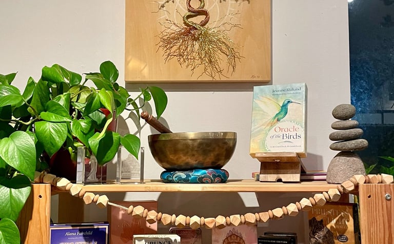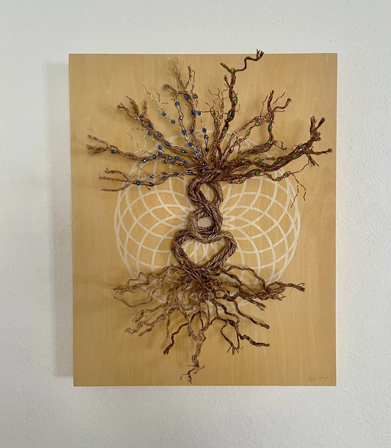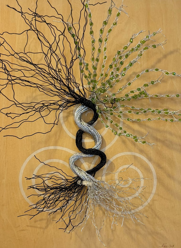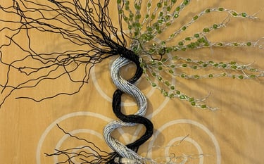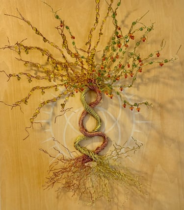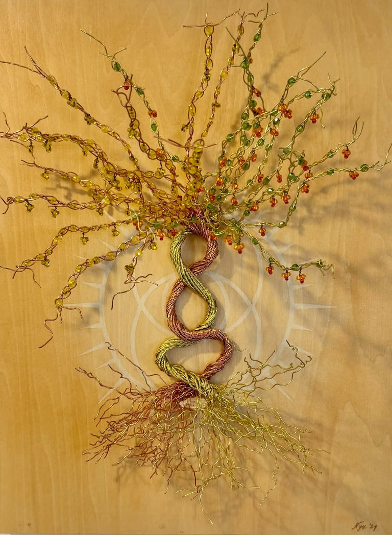 This piece combines the copper and yellow colors of the autumnal equinox with the green and bright new growth of the vernal equinox. It is a cosmic balance of these powerful transitional periods, grounded with a quartz crystal in the roots. Symbols: the meeting of two realms: spiritual / physical, feminine/masculine.